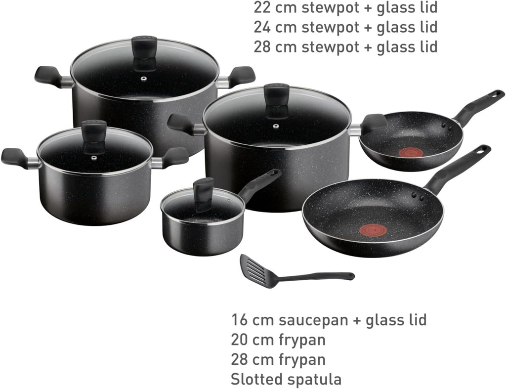 Versatile Design: With a slotted spatula included and available in various sizes, these Tefal pots and pans cater to different cooking styles and preferences, making them a must-have for any kitchen.